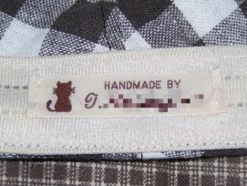 注文していた織りネームとピスネームが届きました。←こちらは、織りネーム。写真は、帽子のサイズテープ部分に縫い付けたもの。ミシンや糸と針など、ハンドメイドっぽいイラストにするか、猫にするか(猫好きなので)、かなり悩みましたが、結局、猫にしました。ピスネーム。こちらは、イラストはなく、文字のみです。これは、スカートです。→ウエストゴムの下に、挟んでみました。←保育園リュック(11/17)にも、ピスネームつけました。ちなみに、少し面倒だったけど、紐の付け位置を直しました。作ってもらったのは、ネオ・ジャパンという会社です。個人向けの織りネームを扱っているところは他にもありますが、スタイル、生地/糸の色、イラストを選択して、文字を指定すればいいだけ、と、簡単だし、比較的安いので、こちらにしました。イラストは、約170種類あります。※ ただし、ネオ・ジャパンは、ネットでの注文は出来ません。 HPから、カタログ請求すると、郵送で、カタログと注文はがき、 見本の織りネームなどが数枚送られてきます。 注文は、その専用はがきで行います。にほんブログ村
