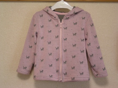 ニット生地で、こどものパーカーを作りました。生地は、近所の手芸店で、偶然見つけたもので、猫柄のピンクとグレーのリバーシブル。ピンクの生地とグレーの生地が、2枚重なった様になってい て、模様のところで、糸が逆になっているのです。たまたま、1m1980円のものが、半額になっていたので買ってしまいました。フードと身頃の継ぎ目、ファスナー部分、裾は、ニットのバイアスで処理しました。脇や袖下部分は、裁ち目かがり(ジグザグ)で処理。フードの縁は、生地の端を利用したので、二つに折って、直線で縫っただけ。フードの左右を合わせる部分と肩は、右の生地のピンク側と左の生地の縫い代は短く切り、右の生地のグレー側の縫い代だけを残して、三つ折りにしました。型紙は、前回のジャケットと同様、こどもブティックCUTITOを参考にしました。身頃の型紙は、前回のジャケットと全く同じものですが、生地が厚めなので、幅を、気持ち大きめにとりました。←仲良しのお友達と公園で 娘(左)の身長は約95cm。 型紙のサイズは、100cmです。こどもブティック秋号CUTITOには、パーカーがいくつか載っていますが、ボタンのものばかりだったので、前身頃の型紙を、前中心で切った形にして、ファスナーを付けました。ママとこどものナチュラルスタイルこどもブティック:クチート 2009秋号ちなみに、私は、こどもブティックを年間購読しています。月刊ではなく、年4回の発行なので、その度買うのも、そう面倒ではないかもしれませんが、忘れっぽい私には、ちょうどいい感じです。手作り子供服。【年間購読】こどもブティックCUCITO(クチート)にほんブログ村