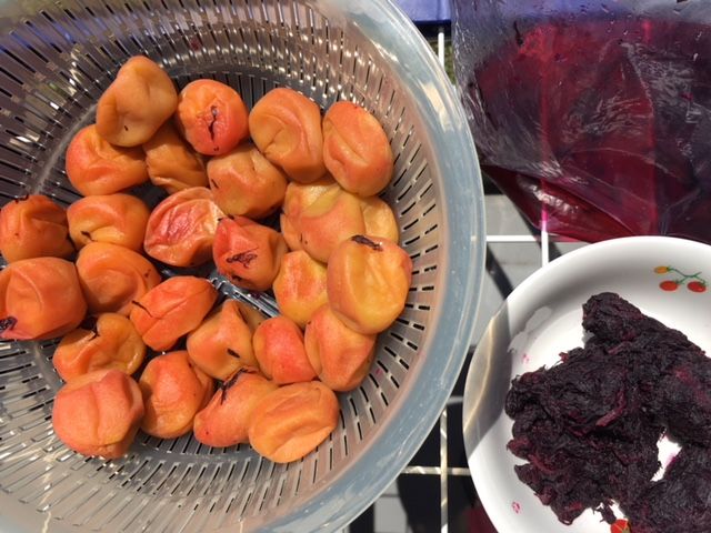 紫蘇はよく絞って、赤梅酢も日にさらす。