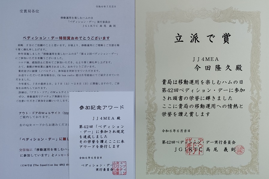 今週末は「移動運用を楽しむハムの日」です。毎年CQ誌に掲載して戴き、昨年の賞状も届きました。主催はアウトドアの高尾さんで毎年恒例行事になりました。移動運用先からノルマ25局以上交信ですがこの時期は暑さ対策が必要でいつも標高900mの高原から運用してました。今年は場所を変えて熱中症対策して運用する予定です。