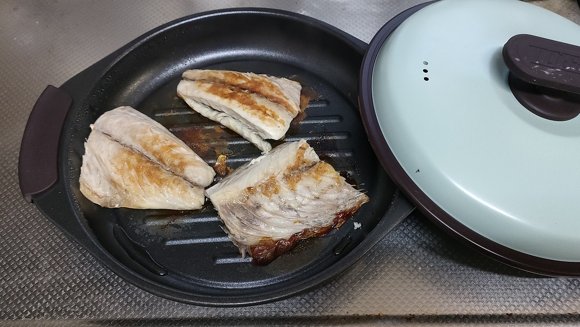 鯖を焼く時はガスグリルで調理してましたが後の掃除が手間でしたが、先日電子レンジ用グリルパンを買ってから肉や魚を調理してます。調理後はグリルパンだけを洗うだけで楽になりました。基本的には500℃でタイマーの時間は添付してる説明書にて書かれており他のレシピも載ってます。