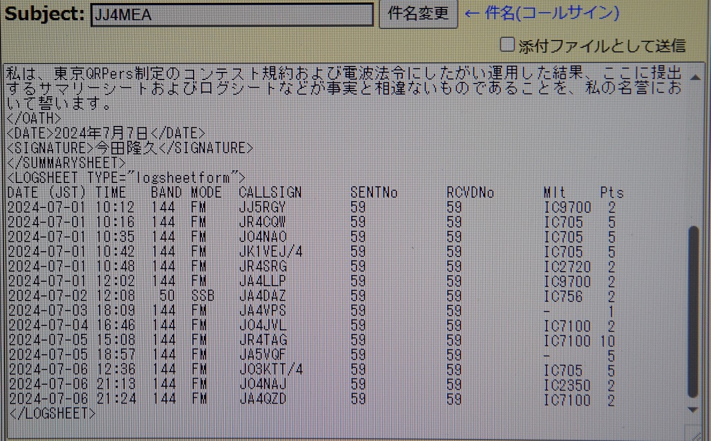第4回IC-705ユーザーQSOパーティ最終日に電子ログ送りました。今回主催は東京QRPersで5W以下の運用でノルマは20Pでした。以前は100Pの年もありましたが今年は楽勝でした。受付は電子ログのみでコメント記載すれば参加賞が貰えます。昨年まで主催はJARL QRP CLUB でHPにコメント集が載ってます。