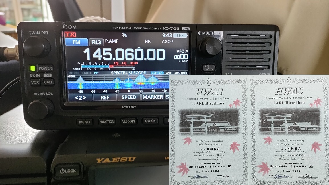 2月に開催された広島WASコンテストの賞状が届きました。3時間で144,430MHz 2部門と短時間ですので疲れません。ごサービス戴いた各局有難うございました。昔は移動運用しQRP5Wで参加してましたが数年前から自宅からIC-705 10Wで運用してます。東京コンテストも部門入賞しましたので賞状が届きましたらご報告致します。
