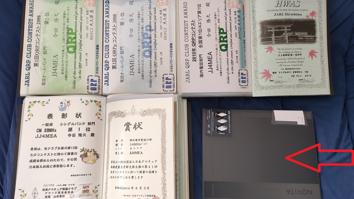 アマチュア無線のコンテスト等の賞状はファイルしてます。既に3冊がいっぱいになり4冊目をamazonで購入しました。写真の賞状は全てQRP5W以下で入賞して貰いました。最近QRPで運用は山ランでハンディ機運用かIC705FT817のQSOパーティだけでQRPコンテストには参加しなくなりました。アワードでは大阪市西区とQRPで交信1区が残ってます。