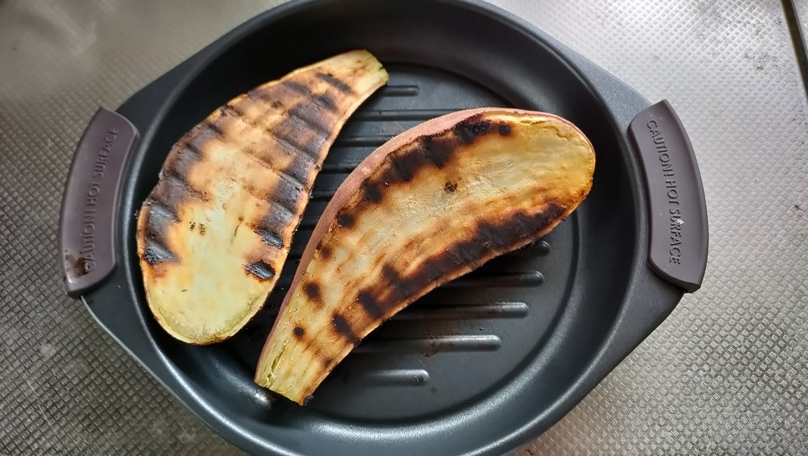 電子レンジで芋を焼くとレンジの中が汚れ掃除が大変ですが電子レンジ用グリルパンで調理すると後の掃除も不要です。菓子パン類は糖分とカロリーが多いので、サツマイモの方が体にも栄養価にも良いそうです。