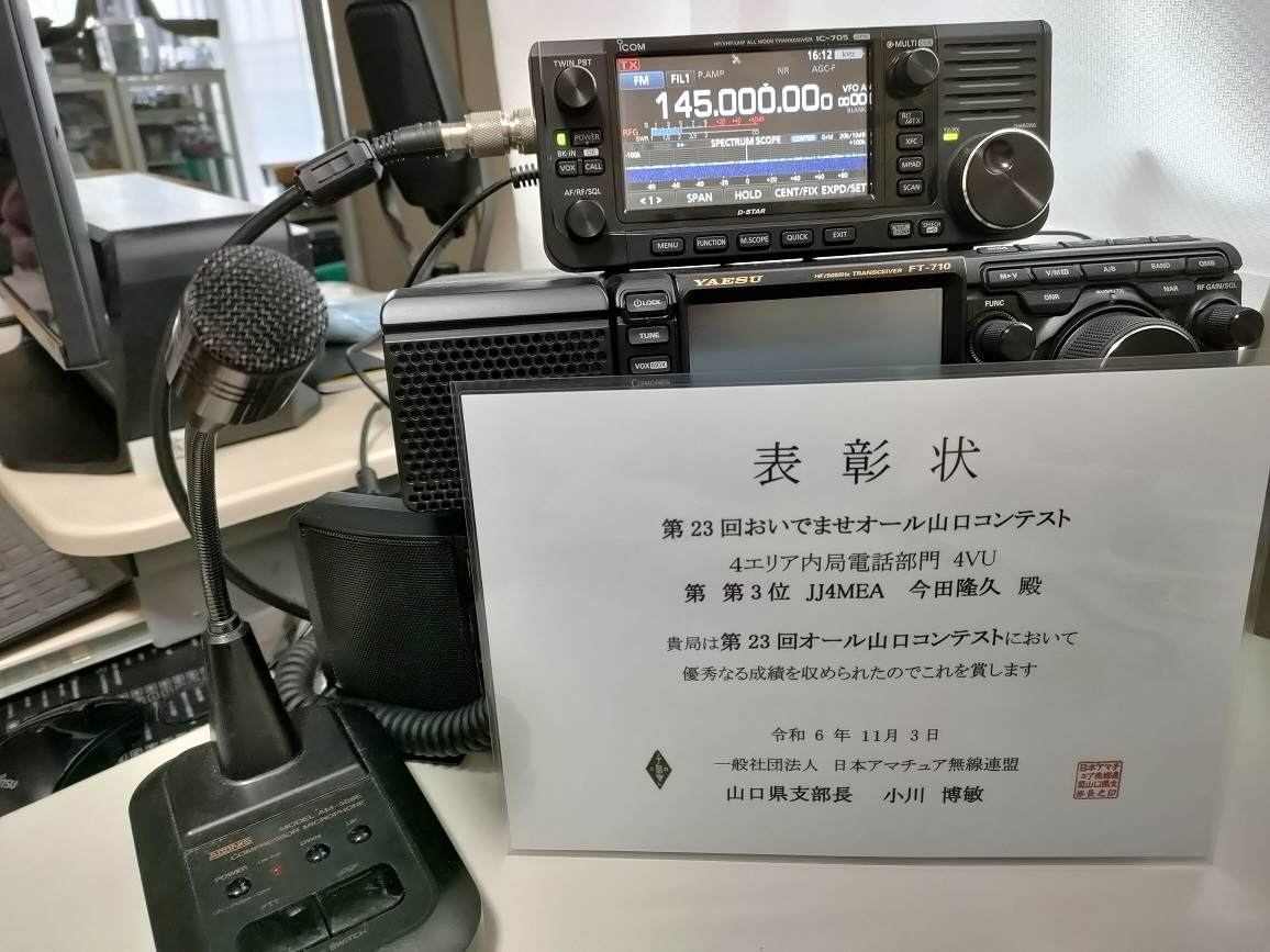 以前は移動運用してQRP5Wでコンテスト参加してました。ここ数年は自宅から IC-705 10Wで自宅から運用です。中国地方4エリア部門ですのでどこと交信しても得点になりアンテナは2.5mのGPですので山口県内との交信は数局だけでした。短時間の運用で交信数も少なかったのですが電子ログを提出すると部門3位の賞状が届きました。