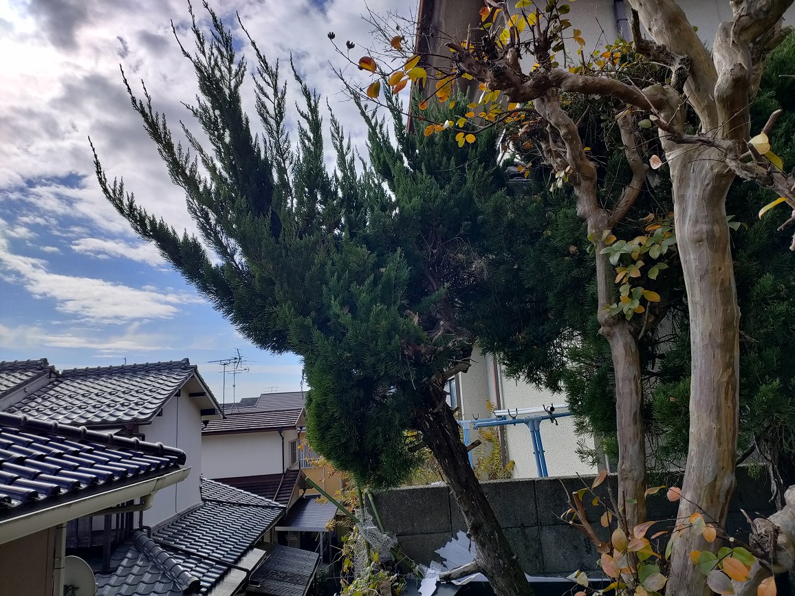植木が隣地にはみ出して伸びてきました。毎年脚立を使って剪定してましたが危険作業です。伐採する事にしましたが隣に落下する恐れがあるので虎ロープで固定し切断しましたが作業手順通りで正解でした。ロープで固定してないと隣地に落ちていました。枝等は細かく裁断し燃えるゴミの日に出します。