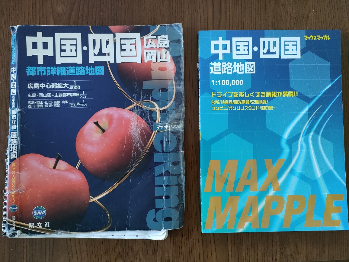 左側の19年前買った道路MAPが古くボロボロになってますので新しく楽天市場に注文しました。(写真右)19年間で新しい道路も入ってます。本屋に行かなくて自宅まで無料で配送して貰えます。本屋では立ち読みする連中が多く皺が入ってる書籍が多いために本雑誌はいつもネット注文してます。楽天ポイントが付くので実質割引で買えました。