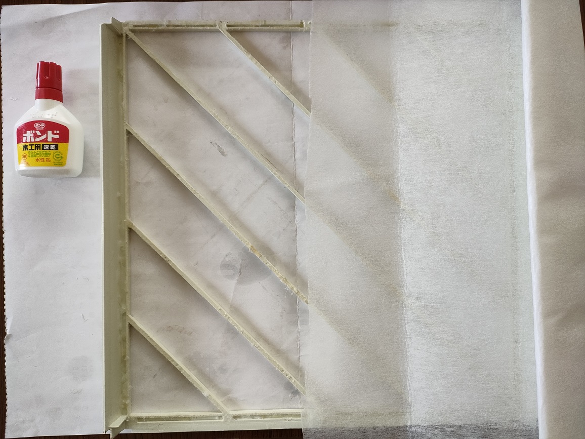 自宅の厨房の換気扇は30数年経ちますがこれまで故障してません。1ヶ月おきに換気扇フィルターを交換してるお陰でしょう。しかし三菱純正の換気扇フィルターは1,000円以上して交換するのが早いため割高になってます。数年前から100円ショップで買ったフィルターに貼り換えて使用してます。接着は木工ボンドが付き易いようです。
