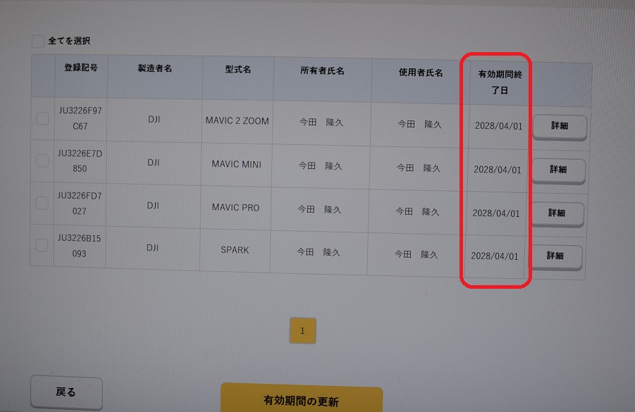 3年前よりドローンの機体登録申請が始まり今年6/19で期間終了しますので早めに登録更新手続き致しましたので2028.6.19迄が有効と思ってましたが期間終了より1ヶ月前に申請するとその日の3年後が有効期間終了だそうで2028.4.1が終了日になりましたこれから更新申請される方は6/19の1ヶ月前から申請された方が良いですので気を付けて下さい。国交省に連絡したらそのような回答でちゃんと表記して欲しい!登録申請を早くして失敗しました。