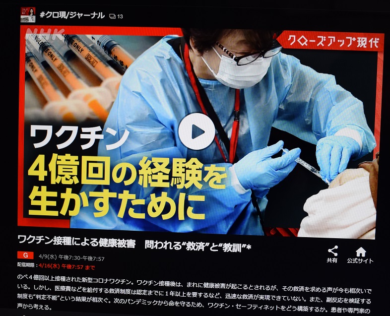 昨晩のNHK「クローズアップ現代」でコロナワクチン接種での健康被害での救済制度の実情をしてました。届出者は13,000名以上で実際はその数倍の方が今でも苦しんでおり政府の対応の遅さを語ってました。ワクチン接種で亡くなったと政府が認めたのは1,000名程度なので認定しない件数も大幅に多いかと思います。ワクチン接種を拒否したので健康被害で悩む事はありませんでした。番組はNHKプラスでもご覧になられます。
