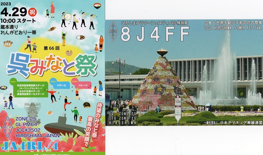 今年の呉みなと祭り JA4RLは144MHzでGETしました。ひろしまフラワーフェスティバル運用は 5/2~5 のみの運用のようでまだ事前運用は聞こえてきません。以前は 8J4FFでしたが昨年から JA4RLになりました。