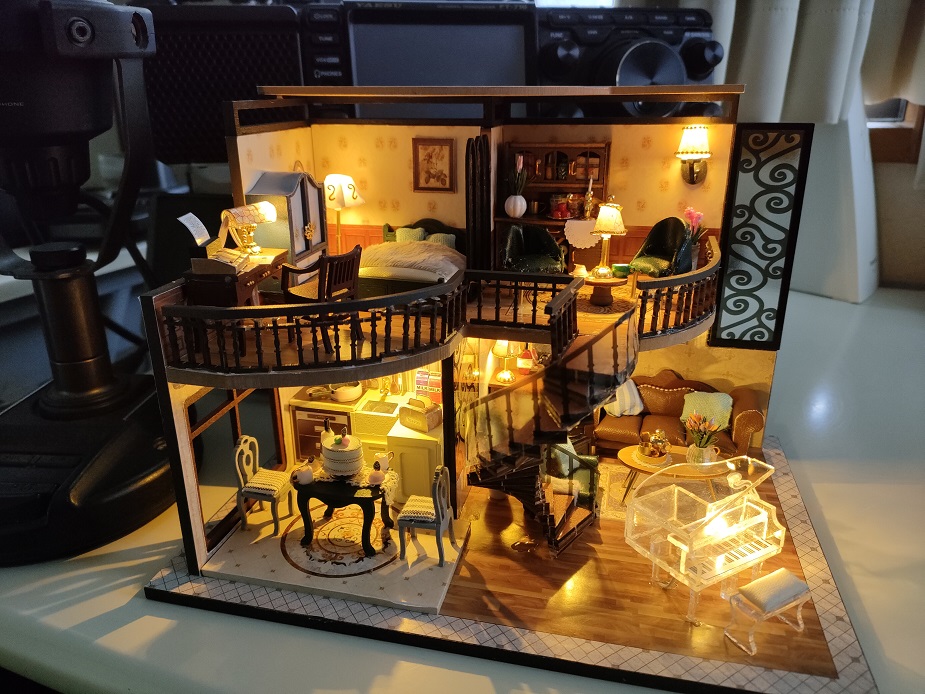 製作開始3ヶ月半で写真の状態です。5月連休中には完成予定です。照明の電源は単三電池2本です。現在3階部分の製作に入りました(写真下)。