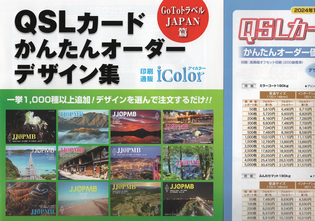 QSLカードはこれまで33種類のカードをオノウエ印刷に注文してましたがカード製作を休止するとの事でしたので新しくiColorのカタログを取り寄せました。オノウエ印刷より価格は高くなりそうですが年内には注文を検討してますので、只今写真をどうするか思案中です。