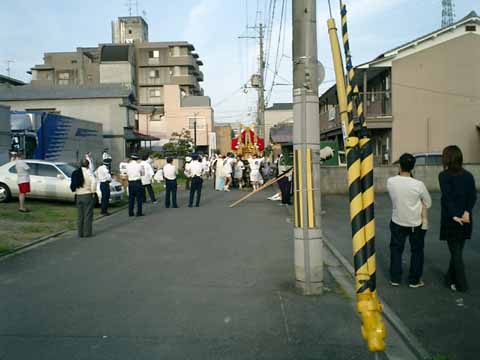 今日は松尾大社の松尾祭(神輿渡御祭) 神幸祭(通称=おいで)京都洛西の総氏神として、京都市西京・右京区のほぼ全域、下京・南・北区の一部約十万戸の氏子の崇敬を集めるほか、古来、開拓、治水、土木、建築、商業、文化、寿命、交通、安産の守護神として仰がれ、特に醸造の祖神として格別な尊敬を受けております。出御祭には松尾七社(大宮社、月読社、櫟谷社、宗像社、三宮社、衣手社、四之社)の神輿(月読社は唐櫃)が、ご本殿のご分霊を受けて、拝殿を三回まわった(拝殿廻し)後順次社頭を出発し、松尾・桂の里を通って桂離宮の東北方から桂川を船で渡り左岸堤防下で七社勢揃いし、古例の団子神饌を献じた後、四基の神輿と唐櫃とは西七条御旅所に、二基の神輿は川勝寺と郡の末社に至り、そこに駐輦されます全文 ココから頂戴しましたこれを読まなかったら、単なるショボイお祭りと紹介するところでございましたぁ(汗)毎年、相手の町内さんからすれば好意で寄ってるんやと聞いてましたので別に来ないでもエエやんけと思ってましたわ その為に休憩所を設営し、町内の役員さんが炊き出しやらお酒を担ぎ手さん達に接待してますからなぁ その後は残り物を役員さんたちで処理してますけどね 別にこの町内のお祭りでも何でもないし、全然興味がおまへんでしたわしかし、色々と読んでるとなかなか由緒正しきお祭りみたいですわ(汗)楽天の方の日記を読ませて戴いたら掲載されてる写真のまんま、前を通り過ぎて行ったヤツやんっって事でこれですわアッチコッチ回って来て、ココで休憩ですわおまわりさんもたくさん張り付いて大変ですなぁ そして、休憩が終わり末社へ帰って行くようですわが町内からも参加させて貰ってるようで、同じハッピを着たご近所さん、発見!この裏切り者!(*^_^*) いやいや、違うっちゅうねん(笑)まぁ、これも歳時記の一つ ホンマ、京都はなんなとおまんなぁ (;´・`)> フゥ... そやそや この松尾大社 前述してありますが、お酒の神様のようですぅ 毎日飲めるように写真に向かってかしわ手でも打つかぁ (~--)/(^^;) なんでやねん! PAN!PAN!( ^-^)∠※.。・:*:・゜`☆、。・:*:・゜`★
