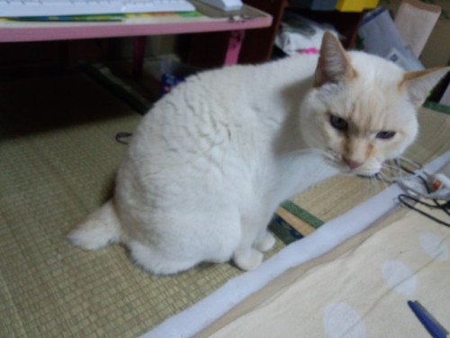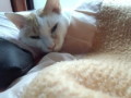 ミケオ君。猫風邪治りました~♪約1か月の通院お疲れ様です。お昼寝中に携帯を向けたら不機嫌なお顔。(そこは私の布団なんだけど。まぁ、いっか(笑))ミケオ君に掛けてあげてるのは、父から譲って貰った毛布です。とても暖かくて私やニャン達のお気に入りです。イカちゃんも大好きでした。