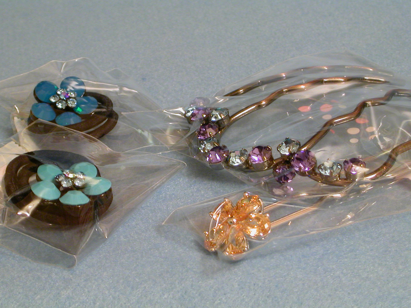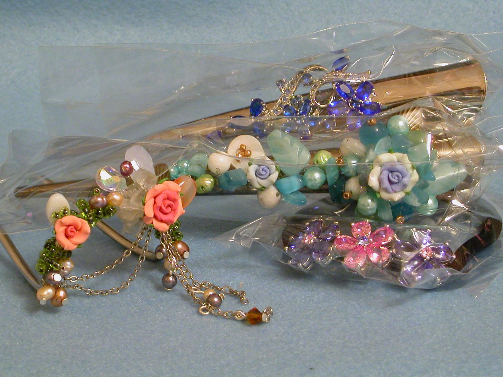ヴィさんで初めてのお買物♪お目当てはコレ!ラベンダー×ライトアメジストを見て目がハートでも売り切れだったので、ラベンダー×ローズに。この配色はhoppehoppeさんのブログの写真で気に入りました。ヴィさんのページで見るより、ローズの色が好みだったのです。実物もなかなか可愛いですよん(*´∀`)b ラベンダーよりもローズのほうがキラキラしてる気が。写真も実物も。いろんな角度から眺めてみましたが、角度のせいではないようです。同じカットでも、濃い色はキラキラ感が出にくいのかな?どうせ買うなら、ねいる屋さんでは売っていないような物をと思い、 ブルーと迷ってレッドにしました。決め手はビーズがグリーンで葉っぱぽかったから。櫛先がカーブしているだけで本当に留まるのか心配で試着してみましたが、全く問題なしでしたブルーも欲しかったので、 ブルーはダッカにしてみました。こちらは天然石の盛り具合がスゴイです。鮮やかなブルーに惹かれました。 ゴテゴテしていなくてスッキリ。だけど、ちょこっと揺れるモチーフが、クールな中にも可愛さがあって良いです。シャンパンも綺麗だな~なんといっても、ヴィさんは価格が良心的なので、気にせずガンガン使えます。取り置き期間も長めで◎。以下も気になります。ライトアメジストLOVEこちらは争奪戦必至。