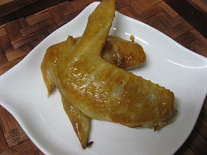 こんにちは~~(^o^) 毎日蒸し暑いですね~こちらは曇っているけど、爽やかさ~がないのよね~ベトベトしていますではでは~ 昨日作った チキンのスモークをご紹介しますね~~手羽先のスモーク お初だよ~3日間くらい ソミュール液につけ込んであったチキン!ですこれは塩出し作業はいりません・・・ キッチンペーパーで水気を拭いて~鶏ハムみたいにラップに包んでボイルします!60度位で20分くらい!ゆであがったら ざるに揚げて~また水気をよく拭き取ってね!夕方涼しくなってから干し網で風乾します~2時間位!いよいよスモークよ~~一度ボイルしてあるし 薫製時間が短いので 中華鍋で薫製します~(^o^)一度に5~6本ずつしか薫製できませんけど・・・(^^;)一回につき 桜チップひとにぎりと~ざらめ大さじ1位を入れて火を付けます~必ず蓋は閉めといてね~ 20分位、飴色になったら完成です!途中裏返してね身がプリッとしまっていて~~でもかなりジューシーでした~今度は胸肉で作ってみます!パンにサンドしたいな~とソミュール液の材料は~・ 水 600cc ・ 塩大さじ3 ・ 砂糖小さじ1 ・ コショウ小さじ1/2・ ローレル 2枚 ・ 粉末チキンスープ 大さじ1・ ショウガスライス2~3枚 ・ あれば香味野菜の切れっ端(ネギ、セロリとか)一度沸騰させて冷ましてから ジップロック等にいれてチキンをつけ込んでくださいね~~~中華鍋で簡単に作れますので 是非ぜひオススメです~~今日のおまけ画像は。。。。笑っちゃってください(^^) わたしのおみ足 (^^;)見えるかな~????クロックス焼け(^^;)ともいいましょうか・・・・一瞬なんだこのアザは~と思いましたけど・・・・日曜日。。。海で日焼けしたようですさすがに ここまでは日焼け止め 塗ってなかったよ~~