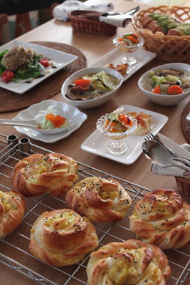 こんばんは~日記が書けるの久しぶり^^「なんか いつもの感じだーー」嬉しくなります。実は週末は 私が体調を崩していましたよ~土曜日の夜中から 嘔吐と下痢に苦しんでいましたこんなに苦しいのは お産以来???嘔吐は止まらなくて 仕舞いには泣きながら吐いてました「泣くくらいならしっかり治してからやれ!!」と主人に喝を入れられっほんとにそうなんですけどね~~そういえば 私が急性盲腸になったときも タクシー読んで自分で行け!って言われて 一人で行きましたが~当然のことなんだけどねっ こんな家族模様が繰り広げられる中 丸一日寝込んでいると・・・・やはり きましたか・・・・長男が翌日から嘔吐 下痢、しかも高熱・・・・今日も学校を休んでいます~よく考えてみたら 先週は火曜日から ほとんど徹夜並みの日々が続いていてそうだ~5日目にして ダウンだわ・・・そんなに経っていたなんて 気づかなかったんです突っ走り過ぎましたね・・・・・(^^;)ホントに今回は大いに反省しました。みなさんにも心配をかけてごめんなさい更新していなくても みなさんの足跡をみるたびに~心配かけてるだろうな~・・・・と思っていました。少しのんびりペースでやって行かなきゃね^^明日の販売も お休みを頂きましたm(_ _)mでは~気を取り直して いつものように・・・(笑)こちらは 6日土曜日。六本木で妹のライブがあって~パンを頼まれていました^^・牛すじカレーパン 27個 ・・ハムチーズロール 6個 ・カフェオレロール 7個・ガーリッククッペ 4個 ・チーズ&ベーコンエピ3個合計47個!!みなさんに喜んでもらえたようで 良かったです土曜日の午後からの話し合いも。。。。まあ 一段落・・・・といきました^^夜は~~~前々から お約束していたお友達のお宅へ・・・お呼ばれしていました^^急いでおかずを作って~お邪魔してきましたよ~とにかく忙しい一週間でした今日も早く寝て 体力を取り戻したいと思います にほんブログ村参加しています^^いつも応援ありがとうございます^^