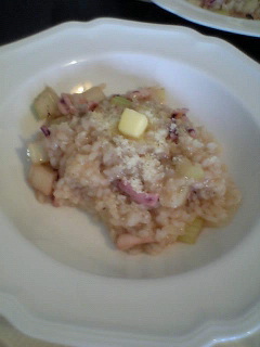 ガラでもないと思いつつ月いちで行っている、お料理教室というかお料理サロン(!)場所は外苑前の先生のお宅ですから。。。。今回はイタリアンな感じで。メニューはナスとズッキーニのかさね焼き、ツナチャバッタ、レンズ豆のスープ。そしてこれは手軽でいいかも。イカとセロリのリゾット。コンソメや白ワインで生米を煮込んだシンプルなリゾットにオリーブオイルとニンニクで炒めたイカとセロリを加えるだけ。イカでご飯はちょっぴりピンクに。そしてセロリの食感がいい感じ。簡単簡単。これならできます。料理はイマ3ぐらいな自分でも。お料理のセンセイはとっても美人で性格もカワイイ。おまけに料理上手なわけで。こんな嫁をもらった旦那様は幸せだろーな。ヒトとして、DNAの違いを感じる・・・。