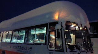 昨日、長野から多摩までバスを回送して、夜11時に新宿をスタートした。長野県には「大雪警報」が出され。。。嫌な予感が。。。 調布から中央道へ入って、談合坂で休憩。早めの昼食以来、固形物を食べていないので、何か無い?とSA内を物色。コンビニのようなコーナーには。。。3個で450円の高級おにぎり(見た目は普通)。街中のコンビニなら半額だよ~と思いながらパス。この談合坂SA(下り線)のフードコートでは、2年前に文句言った覚えがある。その時は妙に硬い肉丼だった。どうやら体質は変わってないらしい。もう一人のドライバーさんに交代して、私はお休みモード。途中、勝沼インターチェンジ、甲府市内で目が覚める。ウトウトしながらいると、南諏訪辺りから路面が白くなってくる。ここから諏訪市内にかけては、下り坂、民家が迫る道。。。嫌な場所。 エージェントに休憩場所指定されてた「おぎのや諏訪店」に入る。ようやく温かいものが食べられる。。。と思ってたのに。。。店内真っ暗。エージェントの緊急連絡先に電話。「営業は25日からだよ~」とサラっと言われる。おいおい。。。談合坂からここまで、もう2時間以上経ってる。。。トイレ休憩取らなきゃ。。。「コンビニで借りられない?」って電話の声にキレそうになるのを堪えて。。。だって、41人の乗客全員をコンビニでって常識じゃないでしょ?。結局、諏訪から中央道乗って諏訪湖SAで休憩することを了承させる。岡谷インターチェンジですぐ降りて。。。塩尻へ。峠は登るほどに白くなって来る。私がハンドル握ってる。。。う~ん、コワイ。融雪剤が撒かれているので、少しはマシだけど、橋の上なんかはどこで凍っているか分からない。35キロから40キロの間でソロソロ降りる。途中からは、完全に真っ白。凍結路面上に雪が乗ってるのが一番コワイ。それまで後ろでアオリを入れてたトラックが急に離れ、二車線になっても追い越そうともしない。松本市内は信号のタイミングが妙に制御されてる。やたら停止させられる。これを突破するには80キロ以上の速度が必要だけど。。。それは自殺行為。ようやく豊科インターチェンジ北の「スイス村」に到着。。。右ウィンカー出しながら減速して。。。15キロ程だったのに。。。ブレーキ踏んだ瞬間にABS作動。前輪も逃げる。。。ギリギリのところで駐車場へ入る。ここは深夜営業してないので、トイレ休憩のみ。もう一人のドライバーさんとチェーン協議。私一人なら、迷わずかけるけど。。。ここからは運転交代なので。。。私は後ろの業務席で路面を見つめる、白い。でも、チェーンは巻いてない。知らないうちに眠りに落ちた。。。気付いたら。。。白馬村、五竜とおみエスカルプラザへの道を登ってた。今回はここで全員降車だから。。。途中で関東のバスがチェーン巻いてる、それも坂道で。多分、ここでスリップした?。。。う~ん、他人事じゃないから。。。エスカルプラザの送迎バス 荷物を降ろしてる最中にスキー場の送迎バスが隣に入った。とっても背の高いバス?と思ったら。。。1メートルの降雪をそのまま積んでる。どうやら大雪警報は本物だった。白馬~長野間 オリンピック道路 そのまま会社に戻る。。。スキーツアーだから。。。雪が無くちゃダメだけど。。。多すぎるのも困る。