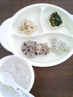 今日の離乳食です 納豆がゆポテトサラダ(チーズ味)鮭きなこヨーグルトばなな豆腐ハンバーグです。 明日で9ヶ月になりますそろそろ焼いたりしてもいいかなぁと思って豆腐ハンバーグを作ってみました。 味付けはしょうゆ2滴です。ひき肉と豆腐を混ぜ混ぜして小さく丸めて潰し火が通りやすいように薄めにして焼きました。油をほんの3滴位使いました。後期(9~11ヶ月)になると1回の食事につき油も3ml.まで使えるみたいです。(こどもちゃれんじ付録いっぱいあそぼ9ヶ月号参照) 納豆は早速昨日道産大豆使用の引き割り納豆を買ってきたので使用しました。今日も完食ですいっぱい食べてくれると嬉しいんですよね~(^∀^♪そろそろ食べれる食材も増えてくるので、少しずつ新しい食材を増やしていきたいと思います。 そうそう、私の離乳食の参考元は、先ほど書いたこどもちゃれんじについてくる冊子と、定期的に近くのジャスコ内でやっている和光堂さんの栄養相談会です。あとは周りから聞いたり、立ち読みで見た本だったりしますが、離乳食に関しては「食」という大事な部分でもあるので、適当な事は書いちゃいけないよなぁ・・・なんて思ってかなり気をつけてます。が、もし間違った事書いてたり、こんな事を聞いたよ~的な事があれば、どんどんコメントお願いします!!早く与えすぎてアレルギー反応が出てしまうお子さんが居たりしたら大変ですしね と言う事で、今日も読んでくださってありがとうございましたぁ 今日の裏技。しけってしまってパリパリ感も香ばしさも失われてしまった焼きのり。そんな捨てられ寸前の焼きのりはめんつゆとみりんで煮詰めましょう。海苔の佃煮が完成です。火にかけることで香ばしさが復活します。ゴマをふり入れれば美味しさ倍増です。←やってみたーいと思った方は応援の↑ポチポチお願いします↑ こっちにも参加してまーす♪