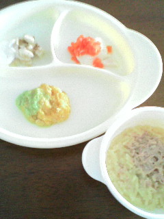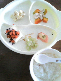 今日のです 今日は午前中に子育てサロンに歩いて行く予定だったのでちょっと手抜きにさせていただきました。和風だしがゆさつまいも×リンゴキャベツの洋風だしあえバナナ×ダノン豆腐のトマトチーズソースがけでした。 天気が悪くなるかと思いきやぽかぽか陽気で寒くもなさそうなので朝からせっせと用意をして9時半には家を出発しました。久々の抱っこ紐での遠出。結構重い・・・しかも速攻で寝たzzz10時10分前に着いてしまって誰も居ない・・・しかもとらも寝ているzzzしばらくぼーっとしていると、いつも来るママ友さん達が来ました。ヨカッタァ~。ひとりぼっちは寂しいもんね。1ヶ月ぶりとあって皆大きくなってました。歩ける子も居たりして子供の成長ってホントに早いなぁと感じましたとらたんもお友達と楽しく遊んでくれました。いつものようにニコニコ 最近とらが可愛くて仕方ない私です親ばかっぷり炸裂です。 ←ランキングに参加しています。クリックして頂けたら嬉しいです。