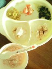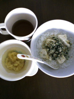 今日のとら飯ですおかゆひじきの煮物バナナヨーグルトじゃが焼き豆腐のほうれん草入り茶碗蒸しでした。 今日は6時に起きた王子。私眠いんですけど・・・そんな事はお構いなしで朝から元気イッパイの王子ですそしてお腹がすいたようで朝からマンママンマと連発してましたご飯を作っている間いつものように台所のゲートにつかまりうーうー唸ってました おかゆの水分がちょっと足りなかったみたいで、ご飯を残したので、一旦椅子から降ろし、お湯と青のりを混ぜて青のりがゆにして食べさせたら完食しました今日のお昼はマカロニにしようと思ってますがソースは何にしようかなぁ・・・ミルクチーズにしようかな??トマトがあればトマトソースにしてあげたいのだけど今日は品切れ。ってかトマトが家にあることが少ない・・・だって高いんだもん。時期じゃないしね~。 今日からパパ通常の仕事に戻りました。日中の布オムツも再開しましたこんなに甘えん坊だった??と思うくらいにベタベタで今も私の横に居ます 参加しちゃってます