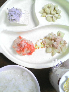 今日のとらです ささみがゆ(写真なし)かぼちゃチーズさつまいも×にんじん豆腐×キャベツ×ひじきバナナ(ベビーダノン混ぜ)でした。 今日は素材を生かしたメニューにしてみました。(単なる手抜きじゃないのか・・・) 初期の頃、おかゆに何でも混ぜて食べさせてしまうと、本来の味が分からなくなったり、ご飯に何か混ぜないと食べれなくなるなど、色々聞かされていたので、味付けはあまりしないようにしてきました。最近はふりかけがないとご飯が食べられない子供が居ると、私も聞いた事があるので、そうはなって欲しくないなぁと。あまりにも同じ食材が続いてしまった事があって申し訳ないと思い、ベビーフードのソース系を買いこんだ事があって、まだ結構残っているのですが味付けがやはり濃い目なのもあって最近はあまり使わないようにしています。まぁたまには濃い味もいいかな?と思った時には使っていますが。かぼちゃやさつまいもはそれだけで美味しいし、にんじんや大根もちゃんと味があるんですよね。豆腐も大豆の味がほんのりするし。本当だったら農家から買った美味しい野菜を素材そのままで食べさせてあげたいなぁって思うんですがね~。私自身、小さい頃おばあちゃんが農家だったので美味しい野菜を食べまくっていました。きゅうりに塩かけてかぶりついていたり。美味しかったナァ。とらが大きくなったら芋掘りとかさせてあげたいです。自然に触れさせてあげたい。なんて言ってる私、大の虫嫌いなんですがね・・・ ←クリックお願いしますランキングに参加中