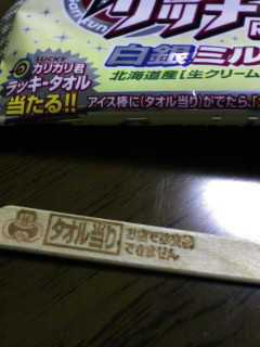 さっきパパがコンビニでアイスを買ってきてくれました。「ガリガリ君 リッチ 白銀ミルク」このアイス、結構な量で結構甘いのですが157キロカロリーと、アイスにしては低カロリー。なので最近ハマってます。何気に食べてたら、当たってました~。もう1本食べれるのか!?と思ったらタオルプレゼントらしいです。封書で送ったらもれなくプレゼントみたいです。 参加中です