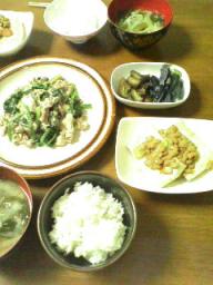 今日の晩御飯です。白米味噌汁(大根、玉ねぎ、ワカメ)おばあちゃんの貰った漬物(きゅうりとなす)豚肉とほうれん草の梅マヨ和え豆腐ステーキ納豆ソースがけでした。 豚肉とほうれん草の梅マヨ和えはクックパッド参考にしました。COOKPADはこちら私、いつもネットで色々レシピを見たりするのですが、材料しかメモしないんですよね。分量もメモしないので途中から結構適当になっちゃいます・・・笑なのでメモによると、梅、マヨネーズ、みりん、ダシ、とあったので、とりあえず豚肉とほうれん草を炒め、お湯を入れ、顆粒だしをパラパラと入れてみりんも少々入れ煮詰めました。汁がなくなってきたら皿に出して、梅マヨで和えました。 豆腐ステーキの方は、フライパンににんにくを炒め、レンジで2分チンした水切り豆腐に塩コショウと小麦粉をまぶし投入。焼けたら上に納豆(たれとからしと子ネギを入れる)をかけて完成です。簡単だけど美味しかったですよ~!! 参加してます