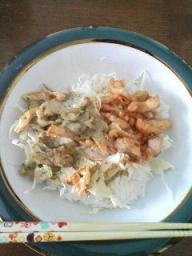 今日の私達親のお昼ご飯です。鶏皮揚げ&かき揚げ丼です。 鶏皮揚げ→少な目の油でパリッと揚げ、たれをかけます。たれはしょうゆ、砂糖、酒を合わせたものです。かき揚げ→じゃがいもの皮、ちくわ(1~2本)を小さく切ります。小麦粉を水で溶いたものに青のりを混ぜ、じゃがいもの皮とちくわを入れます。鶏皮を揚げた油で同じように揚げます。こちらは軽く塩を振ります。ご飯の上に千切りキャベツを乗せ、鶏皮とかき揚げを乗せ、鶏皮にたれをかけたら完成です。すっごく安上がりで美味しいですよ~!! 参加中です☆