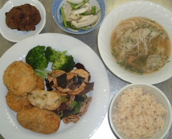 今年初の『クッキング教室』がありました。ヴィーガンズクラブのレシピが中心ですどれも我が家では大好評の人気メニューです。なかでもワンタンスープは寒い今の季節にぴったり麺類やごはんを入れたらこれだけでメインになっちゃいますよお助けメニューでもあります 。。。今日のメニューは。。。 玄米ご飯 ソイーズで作ったワンタンスープ ベジミートときくらげ炒め すき焼き風味コロッケ カブの即席漬け キャロブチップのソフトクッキー 私はクッキー担当で作ったんだけど、おしゃべりに盛り上がっててすっかりオーブンから出すのを忘れちゃってましたしっとりソフトクッキーのはずが、ちょっとビターなハードクッキーになっちゃいましたなんとか食べれただけホッとしましたがぁ~。みんな、「おいしいよ」といって食べてくれてThankYouです