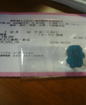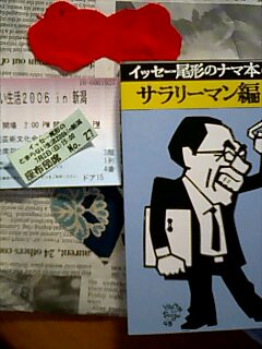 行ってきました!!「イッセー尾形のとまらない生活2006 in 新潟」3階席のチケットでしたが、会場のはからいでステージのまん前の「サブトン」席で観劇しました。私の前は鏡があって、そこで尾形さんが生着替えをしてました。覚えている内容は「産婆の独り言」「アルプスの携帯男」「焼畑ブロガー」「電車風男」「肉屋の店員」「居酒屋のバイト」「早朝ストリートシンガー」一番うけたのは、「アルプスの携帯男」かな?