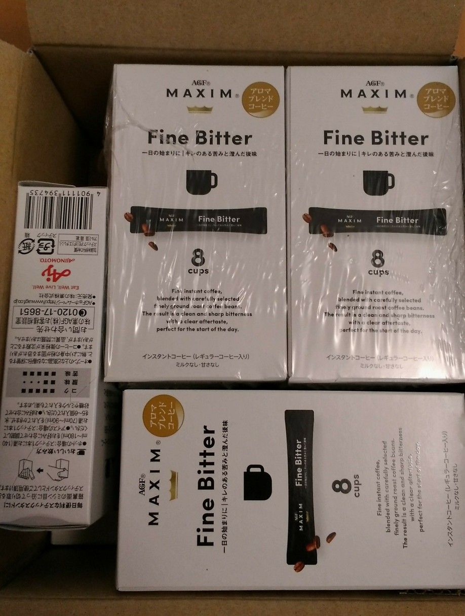 モラタメさんに「マキシム®ファインビター 8本」が10セットも入ったものがお試しで出ていたので、早速ポチッほら、こんなに沢山届いたよ。仕事場で、コーヒーを良く飲むので、こういうスティックタイプめちゃめちゃ簡単でありがたいんですよね私はクリープを入れないと飲めないお子ちゃまなのですが、ブラックもすっきりした飲み心地で美味しいと思います。(クリープ入れて飲んだ感じから想像(笑))