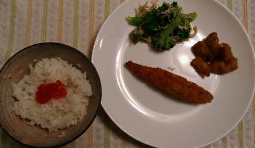 1/6の夜食です。貧疎な食事写真ですいません・・・今日は一日外出していて帰りが遅くなったので、夜食になってしまいました。作るのも面倒なので、買ってきた揚げ物を添えてます。ご飯の上には私の大好物の筋子~安かったので買ってきちゃった~唯一、作ったのが、ブロッコリーのじゃこ和え。作ったといっても、ブロッコリー茹でて、ポン酢とじゃこを和えただけですが・・・。夜食なので、量も少なめにしてます。ほんと、見た目悪い感じでごめんなさ~いお買い得!特撰切れ子甘口すじこ【300g】天然紅鮭筋子【230g】