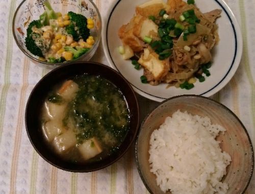 3/19の夕食です。豚肉と厚揚げのすき焼き風です。厚揚げと豚肉って、とっても大好きな組み合わせです~サラダはコーンとブロッコリーにゴマドレかけた感じです。お味噌汁は、あおさとおふです。https://cookpad.com/recipe/3918512甘く煮込んだ、ぶあつ〜い厚揚げそばにのせるだけでジューシーなきつねそばに♪【きつねそば】【厚揚げ】【あげ】