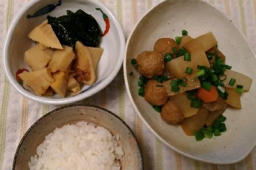 4/18の夕食です。春ですね~。たけのこ貰ったので、若竹煮してみました。こちらを参考にしました。https://cookpad.com/recipe/2186851もう一つは大根と肉団子の煮物です。それはこちらを参考にしました。https://cookpad.com/recipe/4693273若竹煮 1袋 ギフト 惣菜 お惣菜 おかず お試し セット 冷凍 無添加 お弁当 詰め合わせ 食品 煮物 お歳暮たけのこ水煮 3袋 京都産たけのこ水煮170g×3袋【冷凍】 肉団子 1kg 国産 チキンボール タレなし 15g | 肉だんご にくだんご 冷凍 ミートボール 業務用 冷食 冷凍食材 冷凍食品 惣菜 おかず 鳥大 肉加工品 食品 通販 к1000ж