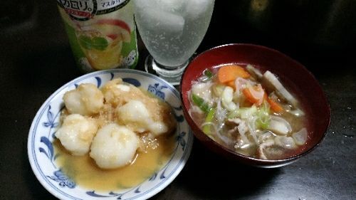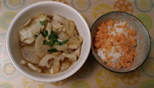 1/18の夕食です。今日は、家にある残り物で・・・。餃子スープの中身は、大根・レンコン・白菜、そして餃子です。スープ餃子という市販の餃子があったので、それを消費するために作りました。こちらの商品ではないですが、これ、美味しそうですね。餃子10個セット 鍋用 水餃子 中華 ギョウザ ギョーザ スープ餃子 もちもち水餃子スープが付いていたので、そのスープも使って適当に味付けしました。醤油ベースで美味しかったです