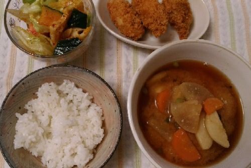 1/12の夕食です。今日は、カキフライだけスーパーで買ってきました。カキフライが大好きなのですが、私以外は誰も食べないんです・・・。どうしてもカキフライが食べたーいってなったので、はい。買いました。満足ですサラダは「かぼちゃのトスサラダ」https://park.ajinomoto.co.jp/recipe/card/709786初めて作りましたが、これ、便利ですね。トスサラ 甘辛チョレギサラダ味(21.6g)トスサラダに、こちら利用させてもらいました。続いて、味噌汁は根菜の味噌汁。https://park.ajinomoto.co.jp/recipe/card/704824野菜高いですよね~。でも、出来るだけ野菜を取っていきたいなと思います。