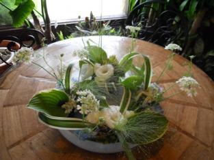 先月は水盤を使い、花材もグリーンを基調とした涼しげなものに仕上がりました