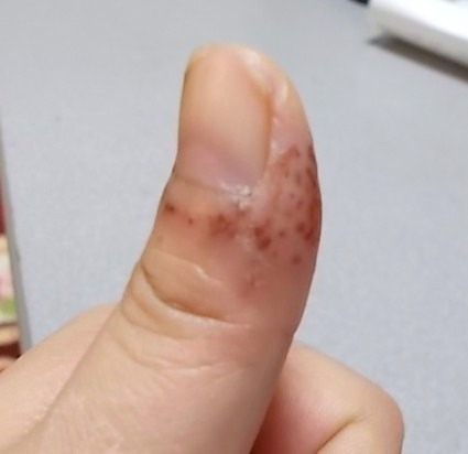 だいぶ傷が治ってきました抗生物質入りの軟膏を塗ってたのですがなかなかかさぶたにならず・・・皮膚が硬くなってきたのでそろそろ治りかけだと思うのですが痛みはないけど時々かゆいのよね~、暑いし。赤い点々は最初に絆創膏を貼ってたので絆創膏の穴ごし?に飛び痺しちゃったのを自分で針焼いて膿出した痕・・・お見苦しくてすみません・・・最初は薬塗ってガーゼ巻いて、グローブして家事してたのですがだいぶ皮膚が落ち着いてきたので今は指サックしてやってます。外出の時はガーゼ巻いて出かけてますがね。これでかさぶたが剥がれたら治癒かな?Designed By チワワン子