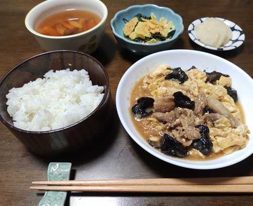 ごきげんよう🌹今日の夜ごはん 木須肉(ムースーロー)ほうれん草のカリカリチーズ乗せ酸辣湯(しめじと人参)紀の川漬けムースーローは、豚肉とキクラゲと卵を炒めたやつです。汁気を飛ばしきれず、つゆだくみたいになったけど、味はとっても美味しゅうございました 生のキクラゲってコリコリ旨いよね。白ごはんに合う合うオカズでした🍚また食べたいムースーローです。ほなっ