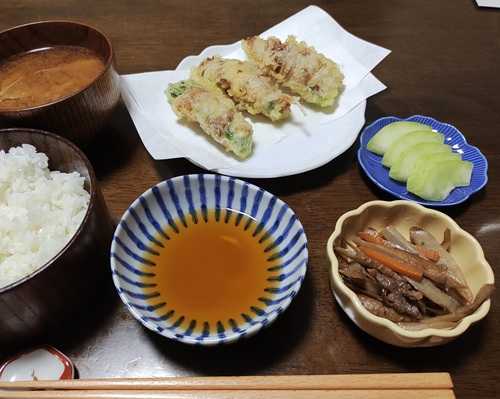 ごきげんよう🌹今日の夜ごはん ゴーヤ肉巻き天ぷらきんぴら(残り)瓜の漬物舞茸の味噌汁昨日の残りのゴーヤに、今日は豚肉を巻いて天ぷらにしました。 衣がサクサクで、ほろ苦いゴーヤが美味しかったです 💚大きめにカットしたので食べ応えも抜群でした。写真は3個やけど、ホンマは6個揚げて・・・完食してます(^_^;)あっ、敷き紙が反対向いとるやん(ま、ええか😅)っつか天ぷら久々に揚げたわ!<おまけのアイス> 変わり種クーリッシュ。今日はソーダフロート味を食べました。美味しいです💙ほなっ