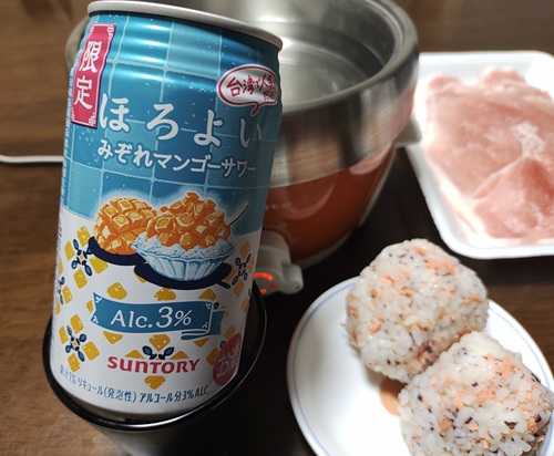 ごきげんよう🌹今日の夜ごはんは豚しゃぶでした。 野菜なしです。豚肉を、ひたすらしゃぶしゃぶして食べました。美味しかったよ 巷で美味しいと噂の「ほろよい・みぞれマンゴーサワー」を飲んでみました🍹みぞれ感は全くわからんけど普通に美味しいです。でも、わかっちゃいたけど甘い。めちゃ甘い。甘いお酒は、ごはんと合わないと思っているので、オニギリ食べる前に飲み干しました。こーいうのは食事じゃない時間に、お風呂上りとか?夏場の暑くてのどが渇いている時とか?そういう時にジュース代わりにゴクゴク飲むと美味しいかもね。ほなっ
