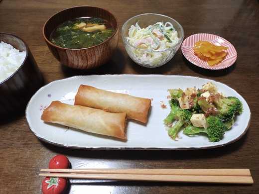 ごきげんよう🌹冷凍庫にずっとある冷凍春巻きを、そろそろ使わなあかんと思って今宵は春巻きです(揚げるだけー) あと、春雨サラダ・ブロッコリーのおかかチーズ和え・ワカメの味噌汁揚げたて・パリパリ・熱々で美味しかったです ブロッコリーはチーズとかつお節を和えて、お醤油をちょっぴり垂らしただけですが、こちらも美味しかったです。冷凍春巻き5本入り。今日は2本だけ揚げる予定が、結局5本揚げたので明日の夜も春巻きです(;^ω^)明日の献立は明後日に変更となり、明日は何もせんで良くなった。というわけで、明日はゆっくりしよう~っと♪(いつもしてるやん!)ほなっ