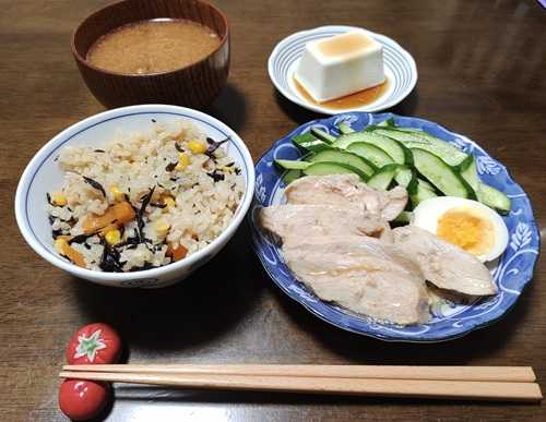 ごきげんよう🌹今日の夜ごはんは鶏チャーシュー あとは、かやくごはん・冷奴・なめこの味噌汁です。鶏チャーシュー作ったの久しぶりだぁ~。久しぶりすぎて調味料がさっぱりわからず???になってました。レシピを探すも見当たらず、超テキトーに作りました。使ったの麺つゆとオイスターソース。テキトーに作ったわりには美味しくできてました しっとり出来てたし、満足でございます 私は焼肉をポン酢で食べるので、バカ兄貴に買った焼肉のタレが余ってて、炒め物に使ったりはするけどなかなか減らず、今日は、かやくごはんを焼肉のタレで味付けしてみました(冒険です)具材は人参・コーン・ひじき。ちょっと味が薄かったな。1合半にタレを大さじ2杯。3杯でも良かったかも?くらい薄味でございました。でもまぁ~美味しかったので良いです。明日の分を取って、残りはいつものごとくオニギリで冷凍しました🍙鶏チャーシューが美味しかったので、近々また食べたいな 💚ほなっ