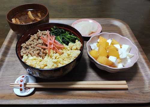 ごきげんよう🌹今日の夜ごはんは、そぼろ丼 柿とモッツアレラのマリネ(昨日の残り)赤だし(舞茸)紀の川漬け届いた「ほうれん草」が「アナタ、ほうれん草ですか?」と思うくらい、細くて小さくて、思わず二度見でございます。間違えて「サラダほうれん草」を買ったのかと思いました💦大好きなそぼろ丼、美味しかったな。子供のころからずっと好きです。2回分作ったので明日も食べるけれど、明日も普通に楽しみなのだ 柿のやつは今日も美味しかったです🧡好きなものを食べられて幸せな週末でございます(*^^)vほなっ