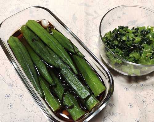 ごきげんよう🌹昨日、仕込んだ保存食2種♪塩オクラわさび小松菜 どちらも「くまの限界食堂」さんのレシピです。今日の夜ごはん お稲荷さん塩オクラ味噌汁(ワカメ)お稲荷さん、酢飯に「ワサビ小松菜」を入れました。ワサビ小松菜は、そのまま食べるとメチャメチャ塩辛いです。白ごはんか、お茶漬けで食べるもんなんだろうね。でも、お稲荷さんに入れると、お揚げの甘さと酢飯の効果で塩辛さは感じなくなり、とっても美味しくなりました。いなりにメッチャ合ってました💚次に作るときは塩分控えめにします。塩オクラ、めっちゃ美味しい~💚💚にんにく効いてて良い感じ。少し甘めで酸味が弱めだったので、次はみりん減らして酢を増やしてみます。アルコール分を飛ばすのに結構沸騰させたので、次は火を止めてから酢を入れても良いかもな。美味しくて2回で完食しました。これはまた作るに決定しています 今日も美味しかった。ごちそうさまでした (。-人-。) ほなっ