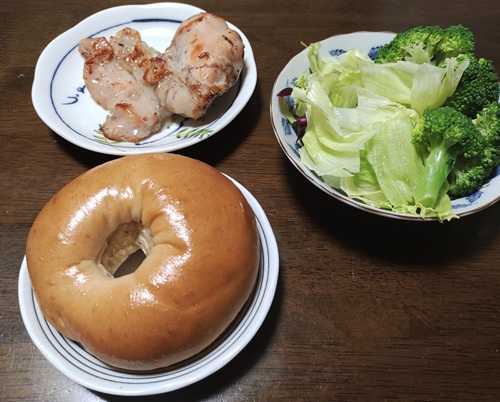 ごきげんよう🌹今日の夜ごはんはベーグルがメイン🥯 朝ごはんちゃうで!昼ごはんでもないで!これが今日の夕食でございます😅サラダと、チンするだけの冷凍チキン。少し前、このチキンを食べたら周りの脂がすごかったので、今日はチンしてからフライパンで焼きました。焼いたら焦げ目もできて、脂っぽさも減ってちょうど良くなりました ベーグルは1個で満腹感もあり腹持ちも良いので、おかずがこんなにショボくても普通に満腹になりました。ま、こんな日もあります(;^ω^)ほなっ